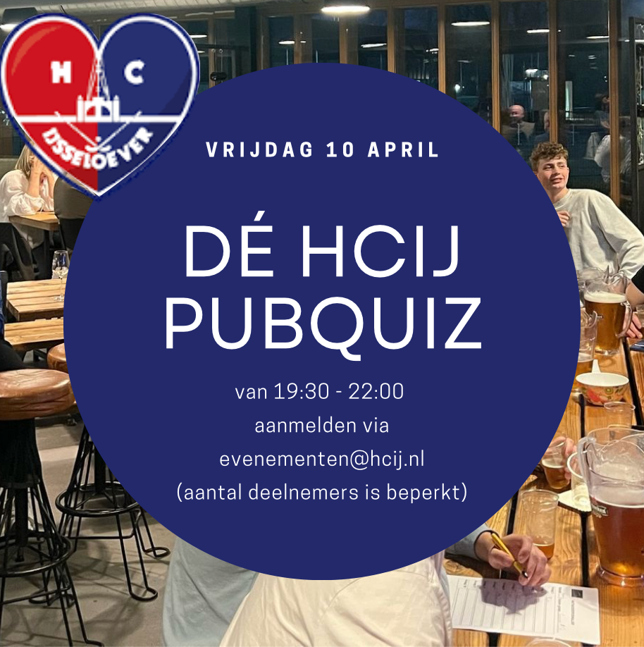 Zijn jullie het slimste team van de club? Test je kennis over verschillende onderwerpen en thema’s tijdens de HCIJ PUBQUIZ vrijdag 11 april! De bar is open vanaf 19.30 uur en de pubquiz start om 20.00 uur. Teams van maximaal zes personen, het inschrijfgeld is €27,50 per team.